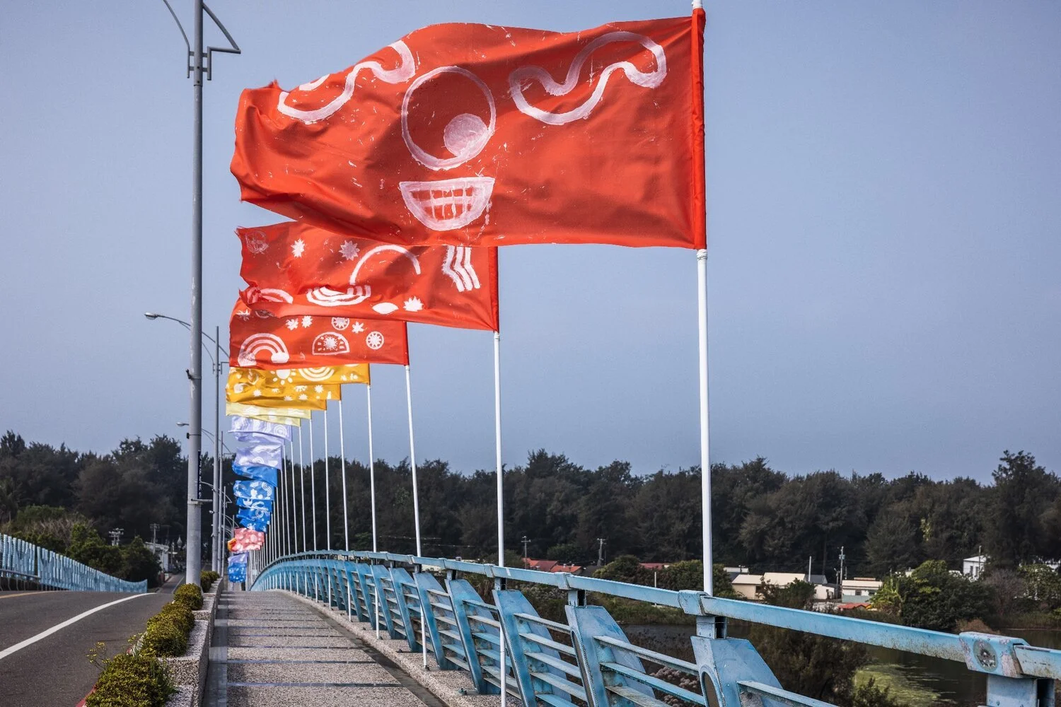 Each elementary school student was asked to combine the various shapes to establish their ideal nation based on their individual values. Issues of nationality are fragile in taiwan, therefore language and symbolism were carefully crafted to incorporate natural elements and colors of the area. The abstract symbols were designed to correspond to Yuguang Island’s natural elements: the sun, the stars, the moon, and the waves.mThe flags decorate the passage that leads to Yuguang Island to welcome visitors the the art festival.